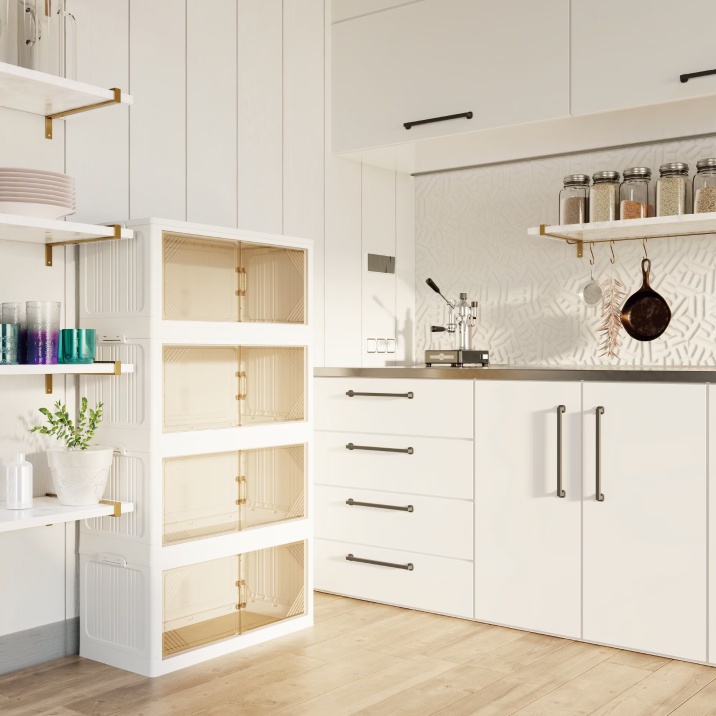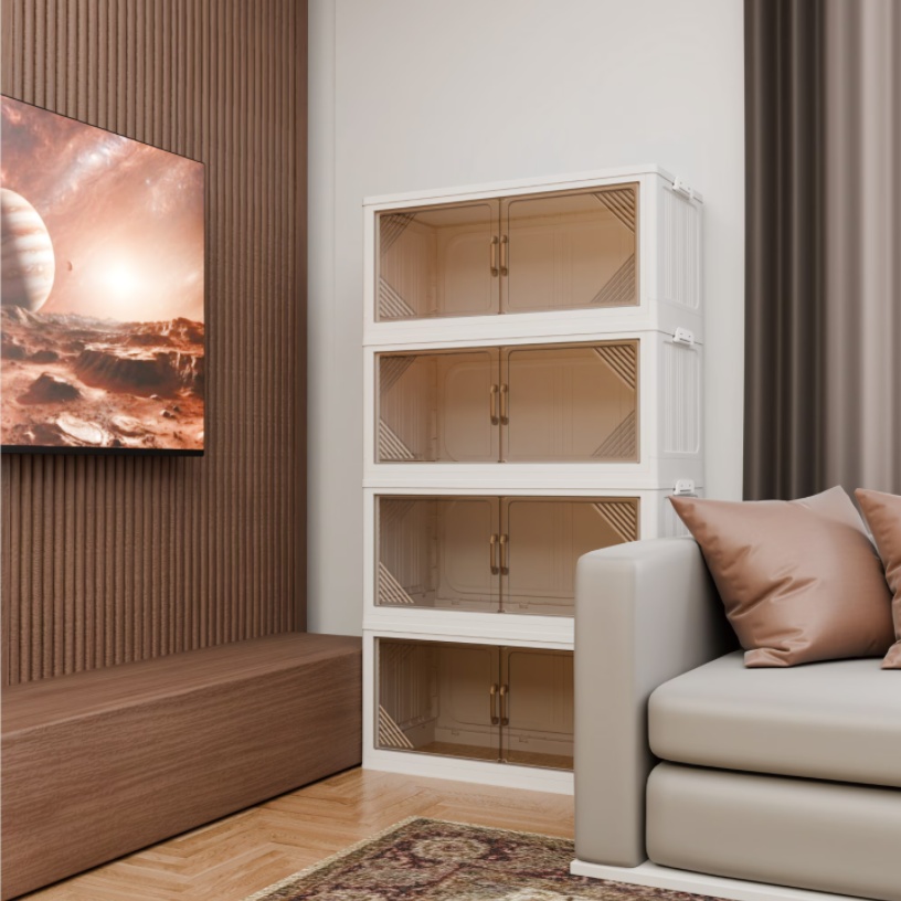 Product name: 573QT 4-Pack 35.4′ Wide Transparent Plastic Storage Cabinets for Closet Organizers and Storage, Folding Storage Box, Stackable Storage Bins with Open Front Door