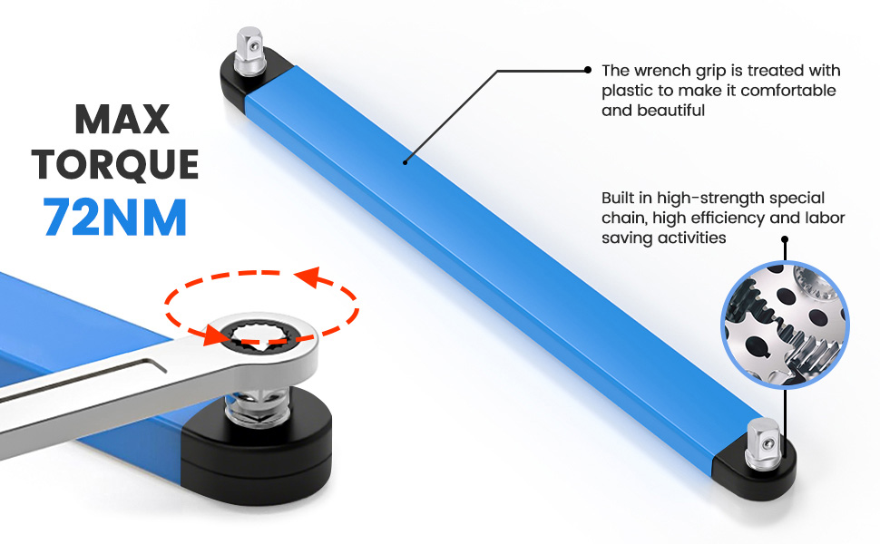 - DESIGN: The internal mechanism of this wrench features a robust steel structure, coated with chrome plating and encased in a protective plastic covering. Its 0° swing arc enables effortless access to tightly secured fasteners. The incorporation of a chain drive mechanism enhances both the smoothness of operation and the overall durability of the wrench.